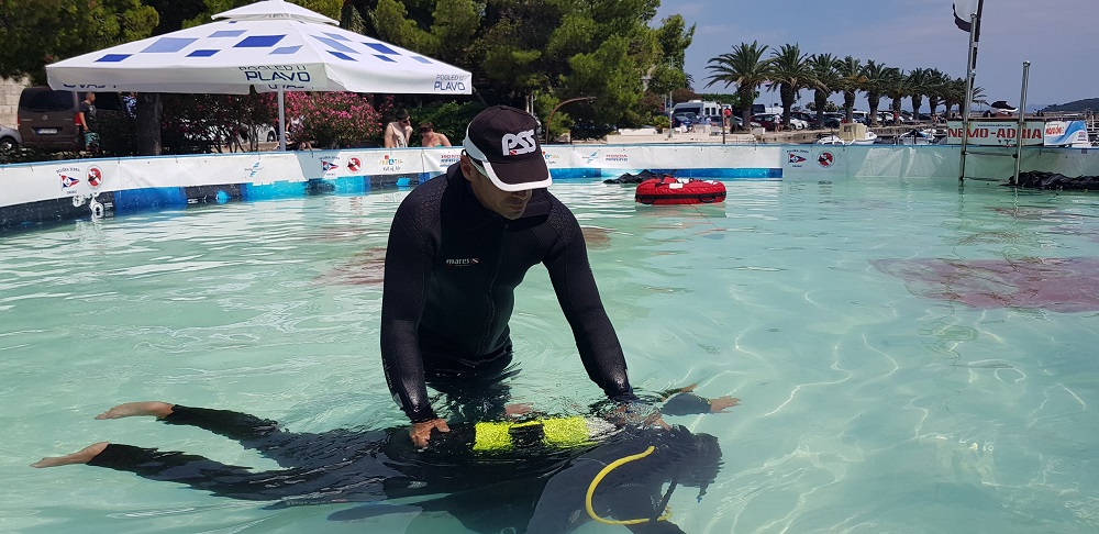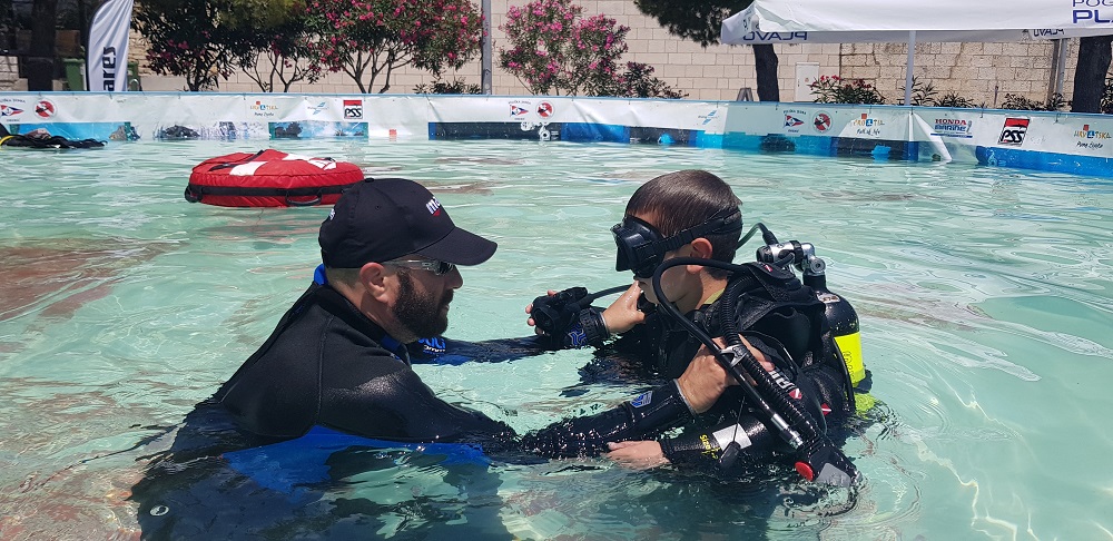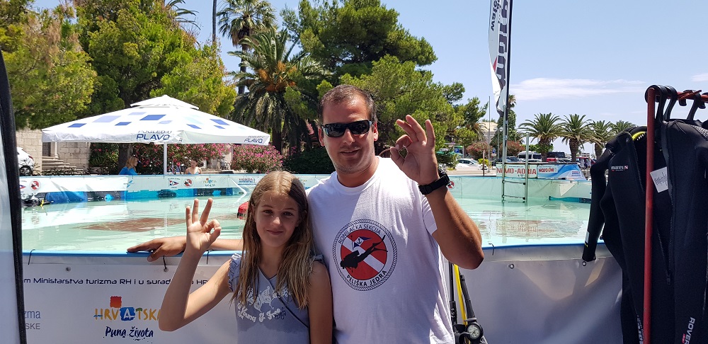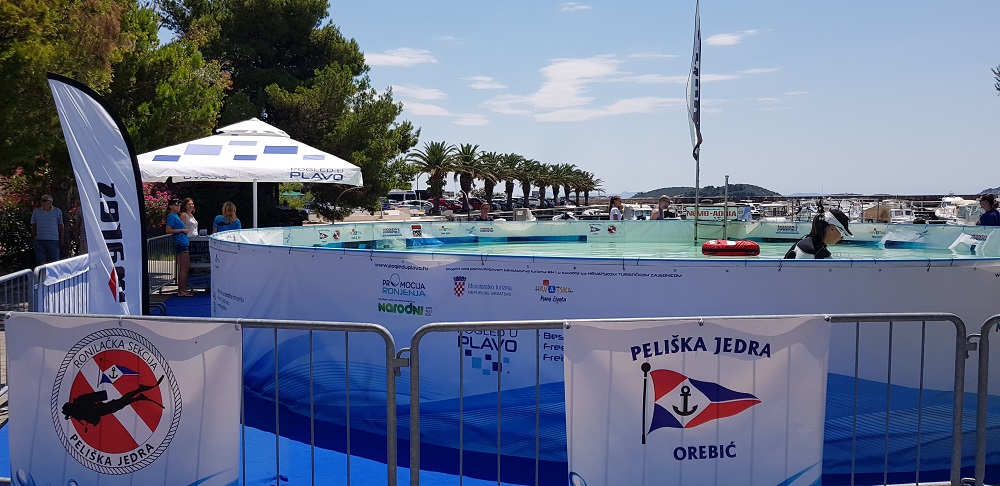 Brojni posjetitelji Pogleda u plavo nakon kraće poduke o ronjenju i upoznavanja s ronilačkom opremom imali su priliku besplatno zaroniti pod punom ronilačkom opremom uz stručni nadzor ronioca i instruktora ronjenja ronilačke sekcije Peliških jedara.